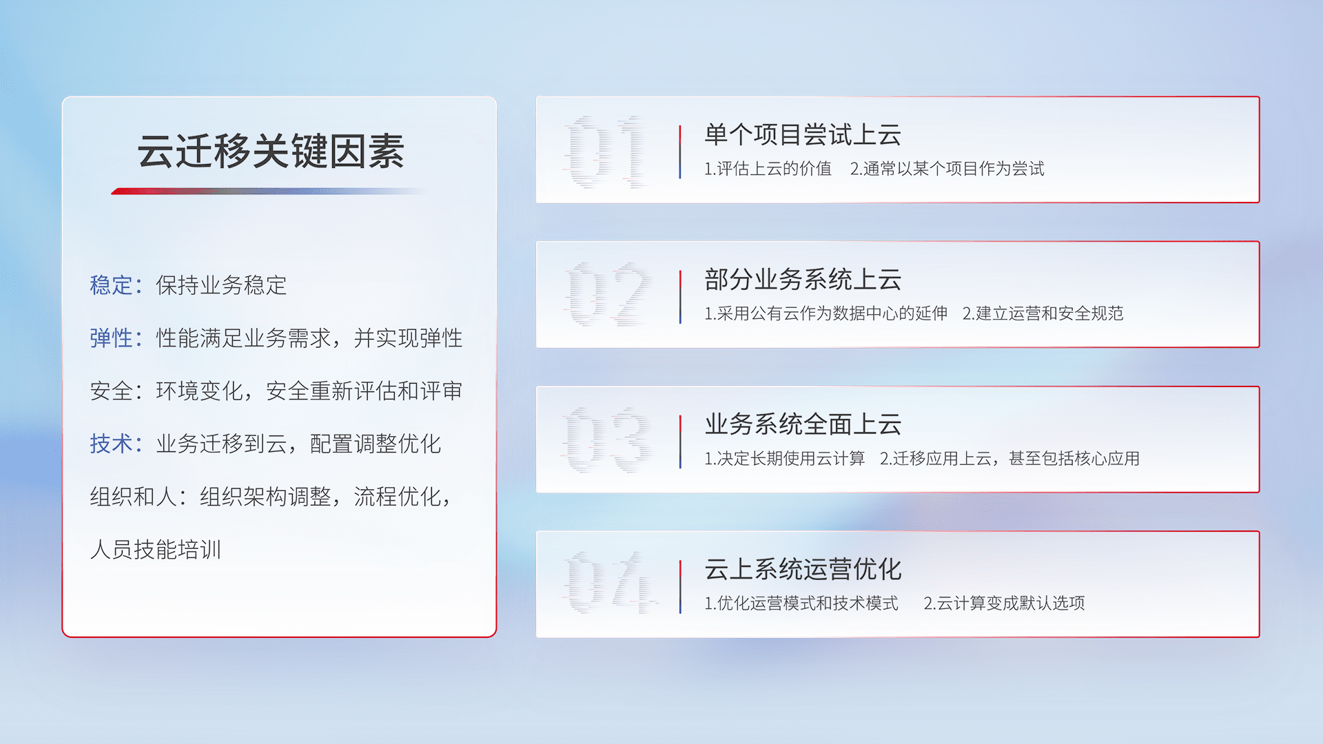 结合实际业务,,,从规划设计、、云平台选型、、云原生改造、、、数据迁移、、、集成交付,,,迁移全过程为客户识别最佳上云路径,,,,做好风险识别管理,,,,设计网络架构、、身份权限、、、、安全审计合规、、操作审计、、日志审计、、监控告警策略、、多站点容灾设计等,,对云上基础设施进行整体规划,,,提升IT治理水平,,以满足弹性、、高可用、、高性能的需求。。