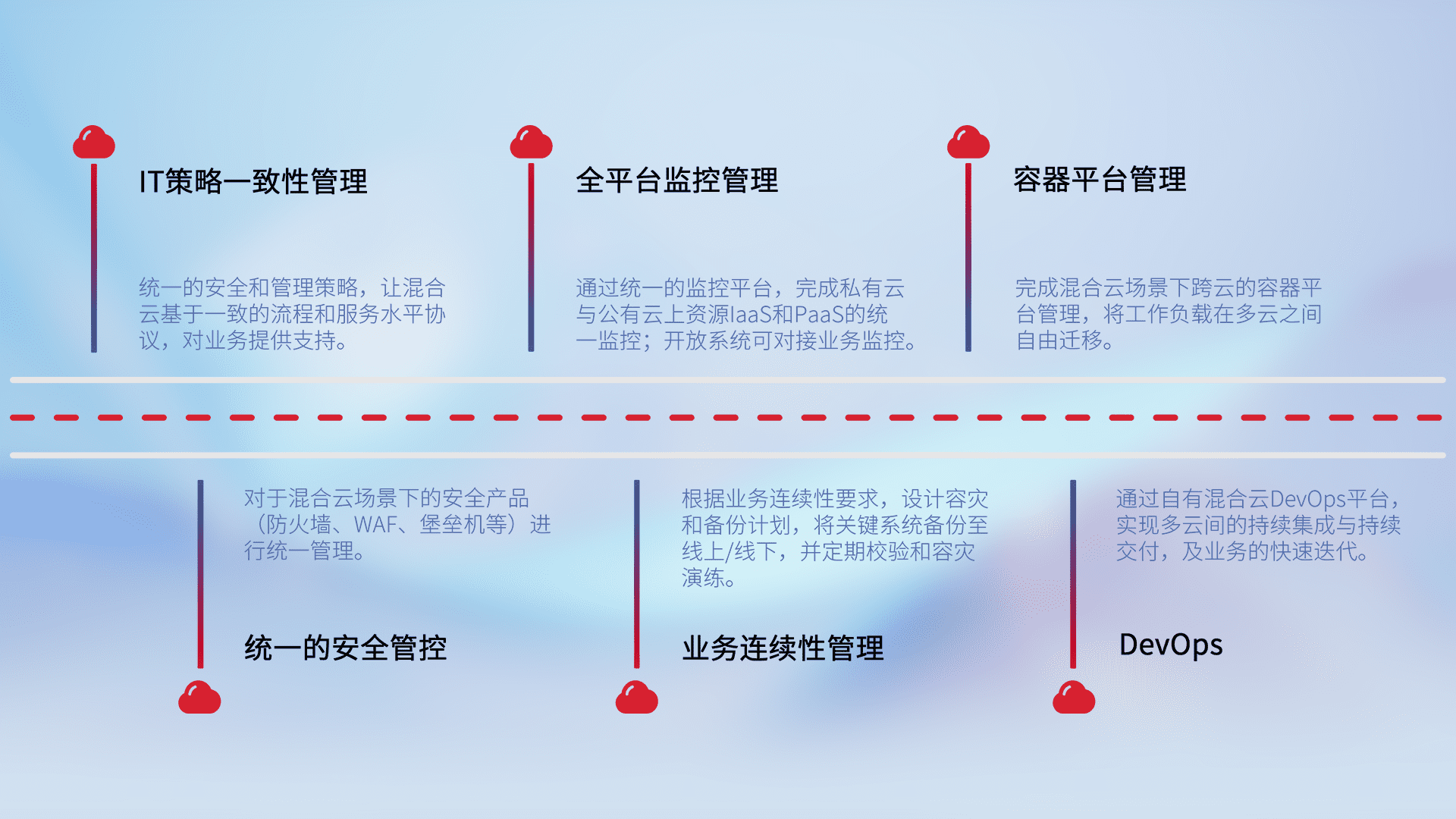 通过多云纳管,,,,以统一的资源数据模型把客户的云资源进行抽象和封装,,,进而实现对多云资源的统一操作,,,,保障云资源管理的可靠性、、、、稳定性与可用性。。。量身定制化运维内容,,,配置、、开发运维、、补丁管理、、备份、、监控、、、认证和访问管理、、审计和日常巡检等,,保障在用云过程中的可靠度,,稳定度以及高可用率。。。。